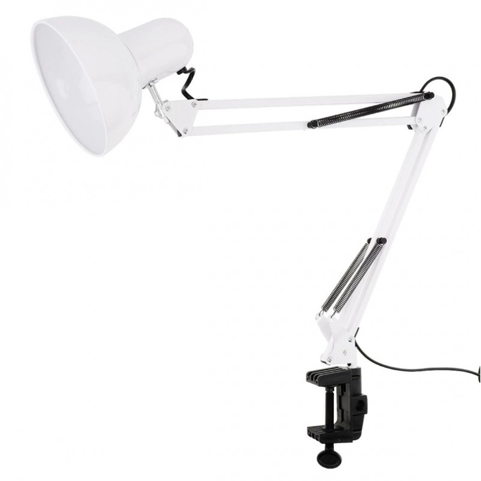 Белая настольная лампа с длинной рукоятью на зажиме к столу
