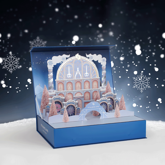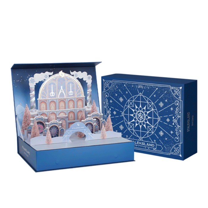 Дизайн набору-адвенту створений, щоб напередодні свята подарувати атмосферу зимової казки. Новорічний Адвент календар Staleks Pro Staleksland 2025 базовий набір для манікюру розкладається у вигляді чарівної фабрики Staleksland — композиції з різдвяними будинками і мініатюрними деталями. Сталексленд символізує місце, де з "зоряного сталевого пилу" народжуються нейл-інструменти, здатні творити з нігтиками справжню магію. Відкриття кожної коробочки — це частка тепла, затишку й очікування дива.