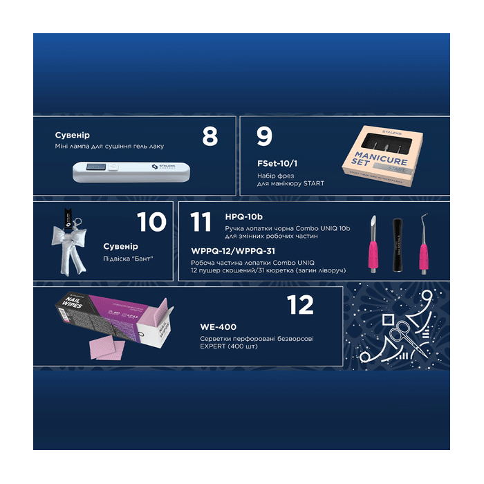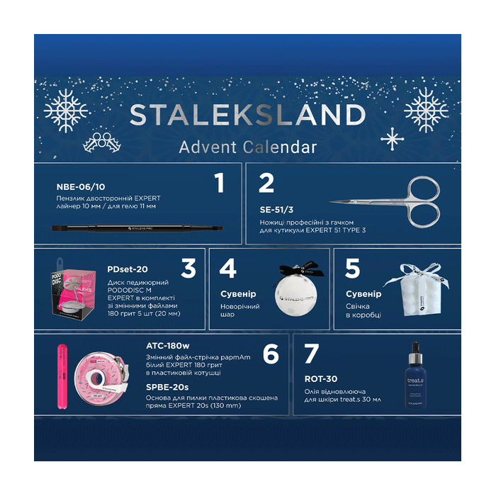 — подорож у світ краси та різдвяної магії. Святковий набір наповнений професійними інструментами, засобами для манікюру і педикюру та приємними сюрпризами від Staleks Pro. У кожній коробочці на вас чекає відкриття, яке принесе не тільки емоції, а й користь у роботі чи догляді за собою.